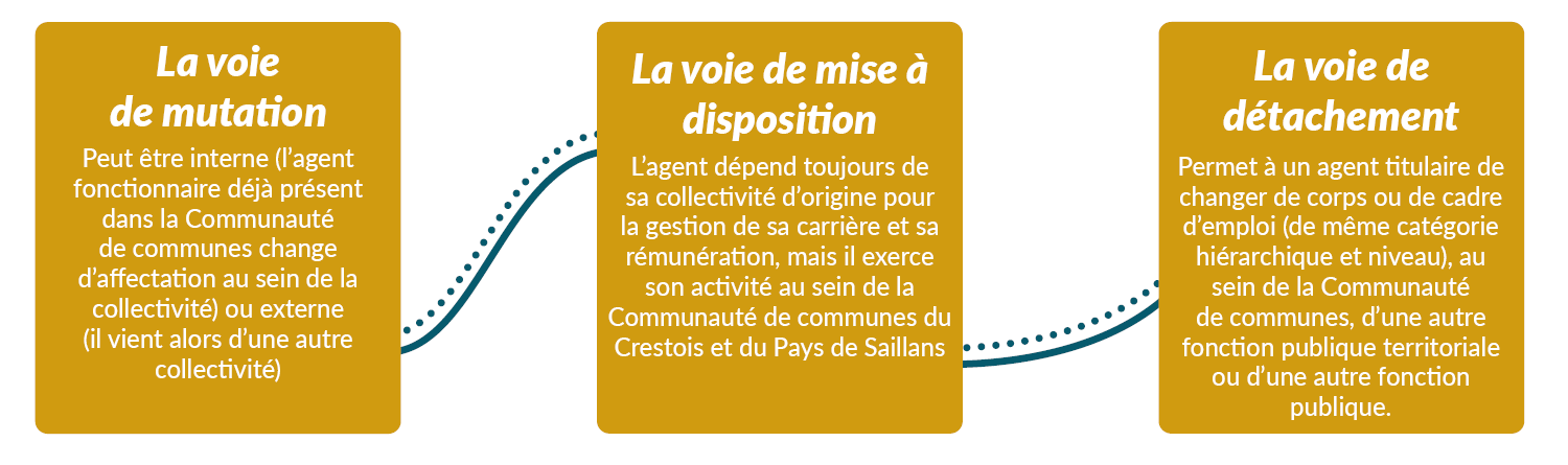 La Communauté de communes du Crestois et du Pays de Saillans – Cœur de Drôme relève de la fonction publique territoriale, au même titre que la Région, le Département et les communes. Différents modes de recrutement existent pour intégrer la fonction publique territoriale et les agents sont soumis à des obligations et bénéficient de droits, dont les modalités sont régies par des règles spécifiques.